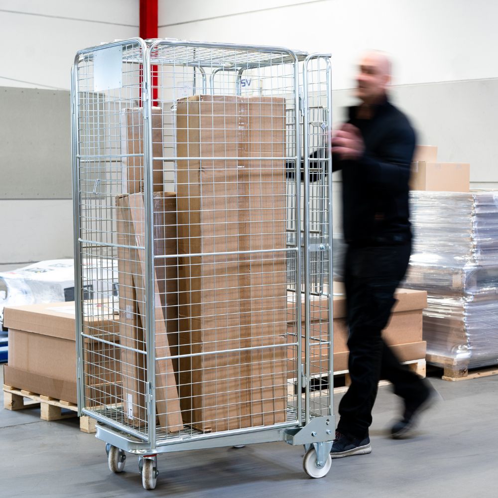 I många pack- och plockflöden kombineras den mobila arbetsytan med rullcontainers som gör det enkelt att samla gods och transportera vidare mellan olika zoner i lagret. Tillsammans skapas ett effektivt flöde från plock till färdig leverans.