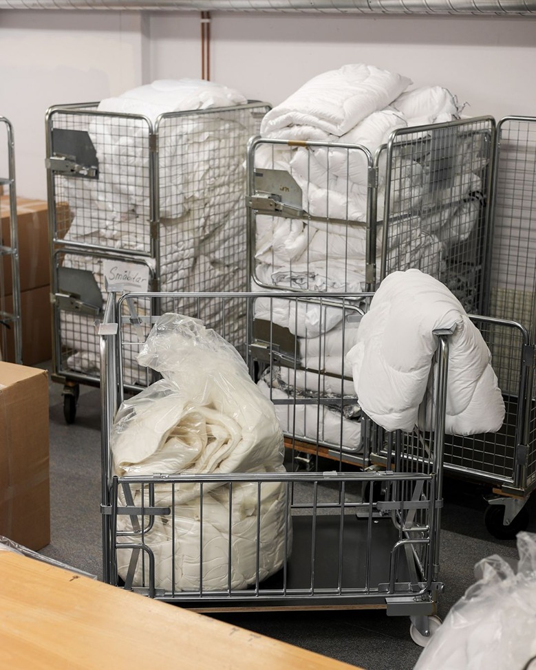Intern logistik: Hyllvagnar och pallvagnar används för förvaring, uppdelning och transport av vikta textilier eller förbrukningsartiklar.